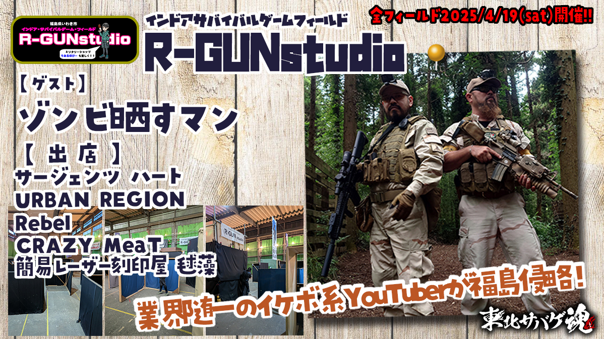 | サバゲイベント前日だよ全員集合(サバゲ魂前日祭)満員御礼 2025年4月19日(土)9:00~16:00 会費 1人¥3.000-(弁当付き) ※当日はご予約者のみ入場可能 限定40名(駐車場の都合上30台になりましたら人数に達しなくても締め切らせていただきます乗り合わせご協力宜しくお願い致します) (2/17より予約受付開始)予約はLINEのみ ★ゲスト ゾンビ晒すマン様 ●出店 サージェンツハート様 ●出店 URBAN REGION様 ●出店 Rebel様 ●出店 CRAZY MeaT ●出店 毬藻@趣味の出張レーザー刻印屋様 ★特別協賛 東北サバゲ魂入場無料チケット レギユレーションはR-GUNレギュレーションをご確認ください 参加要件 18歳以上(高校在学年齢不可) 代表者1名に付き6名まで申し込み可能 (2週間を切るキャンセルの場合キャンセル料が発生します) 参加費の事前納入にご協力お願い致します 前日だよ全員集合inR-GUNstudio予約用ページ 4/19(土)は予約者のみの対応となります 御予約の無い方の立ち入りをご遠慮願います |